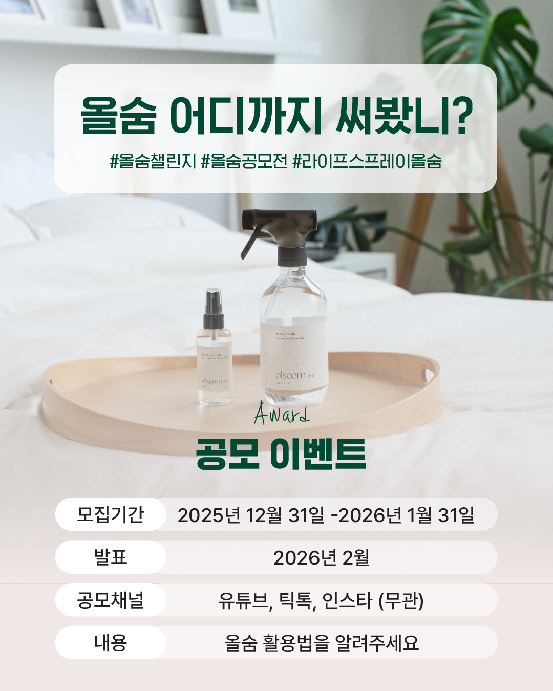 일상의 시작은 침구 정리부터! 깨끗한 침구류에 미리 올숨을 분사해 주세요.냄새의 원인물질을 차단하여 쾌적한 상태를 오래 유지시켜 줍니다.